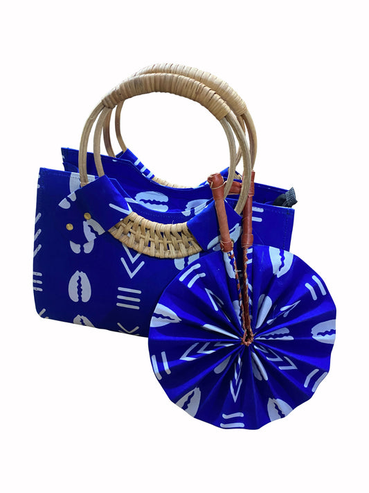 African Elegance Set – Handgefertigte Damentasche mit passendem Fächer | Baumwolle & Leder | 35 x 33 x 15 cm | Made in Ghana