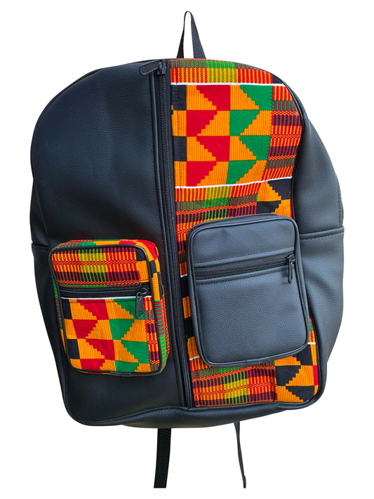 Kente Journey Backpack – 100% handmade aus Leder & Baumwolle | 40 x 40 x 20 cm | Tradition trifft Moderne
