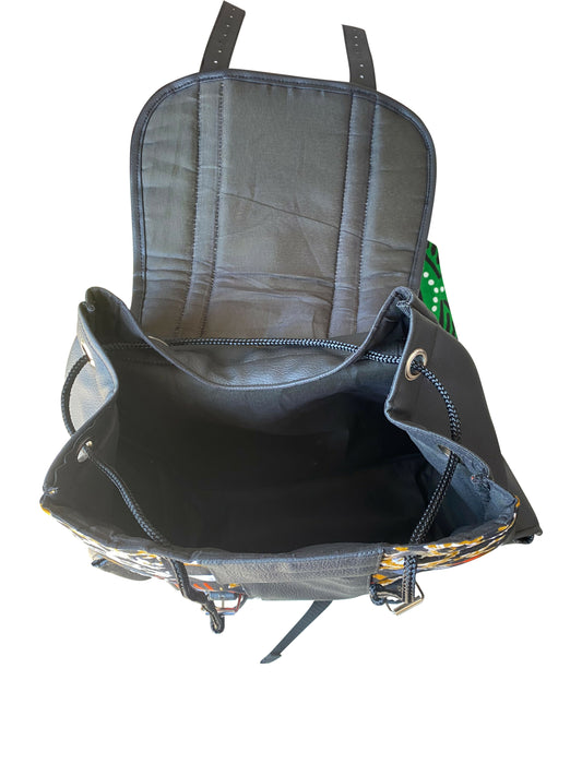 Blue & Black African Roots Rucksack Kente-Stoff & Leder aus Ghana