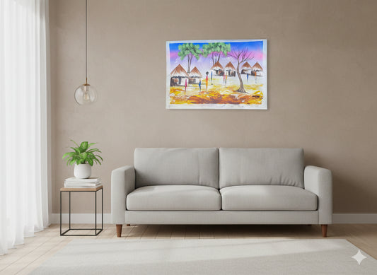 " Quiet Settlement / Dorf mit Strohdächern" Handgemaltes Acrylbild aus Ghana (50 × 69 cm)