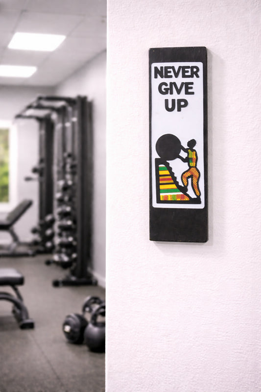 NEVER GIVE UP Handgefertigtes Wandbild aus Ghana auf Ebenholz