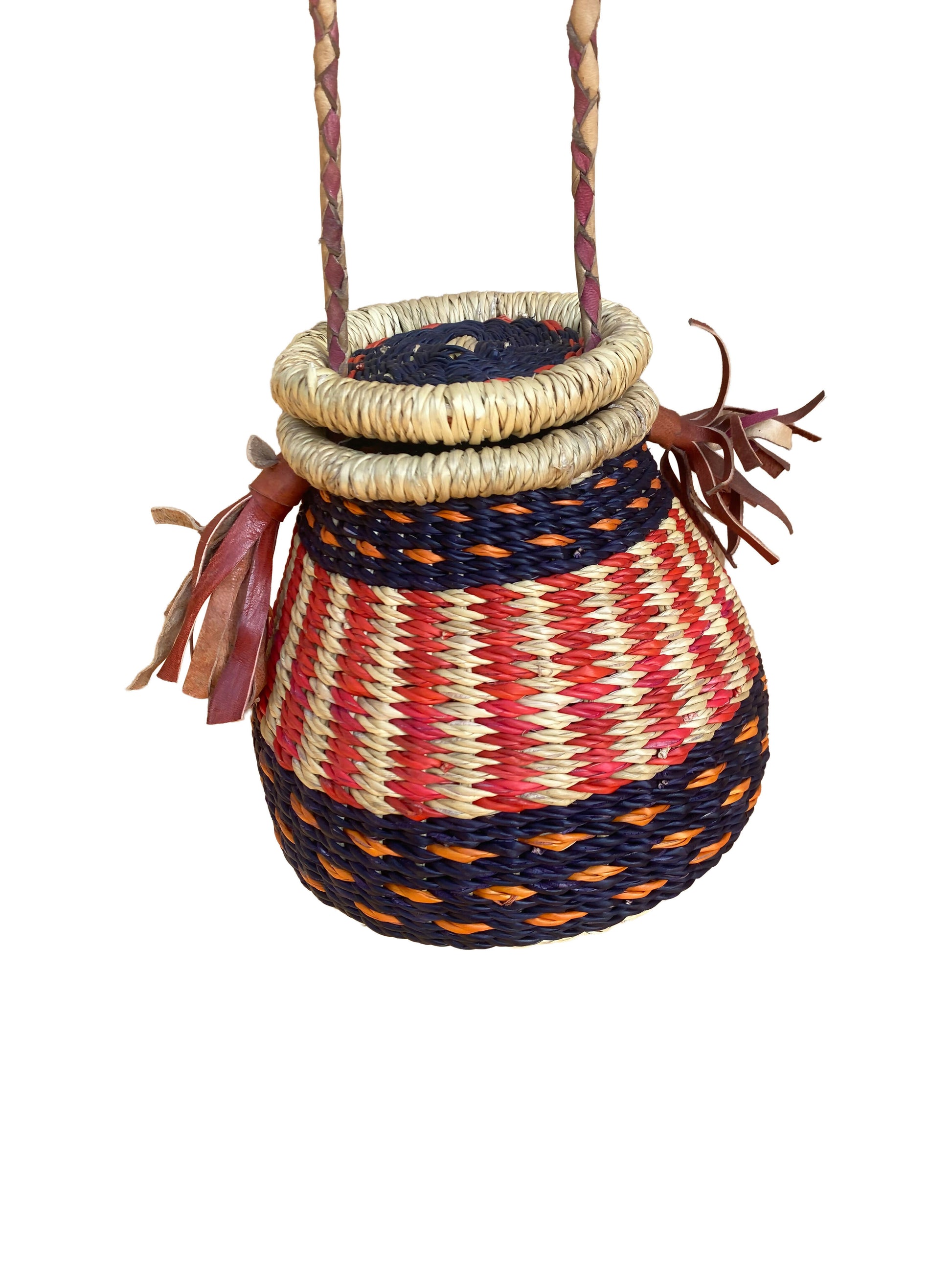 Dieser Umhängekorb wird in traditioneller Handarbeit aus Elefantengras gefertigt. Das Material ist widerstandsfähig, flexibel und besitzt eine angenehme natürliche Haptik. Der Trageriemen besteht aus geflochtenem Ziegenleder und sorgt für Stabilität sowie eine längere Nutzungsdauer. Seitlich angebrachte Lederdetails dienen als Verstärkung und zeigen die handwerkliche Verarbeitung.