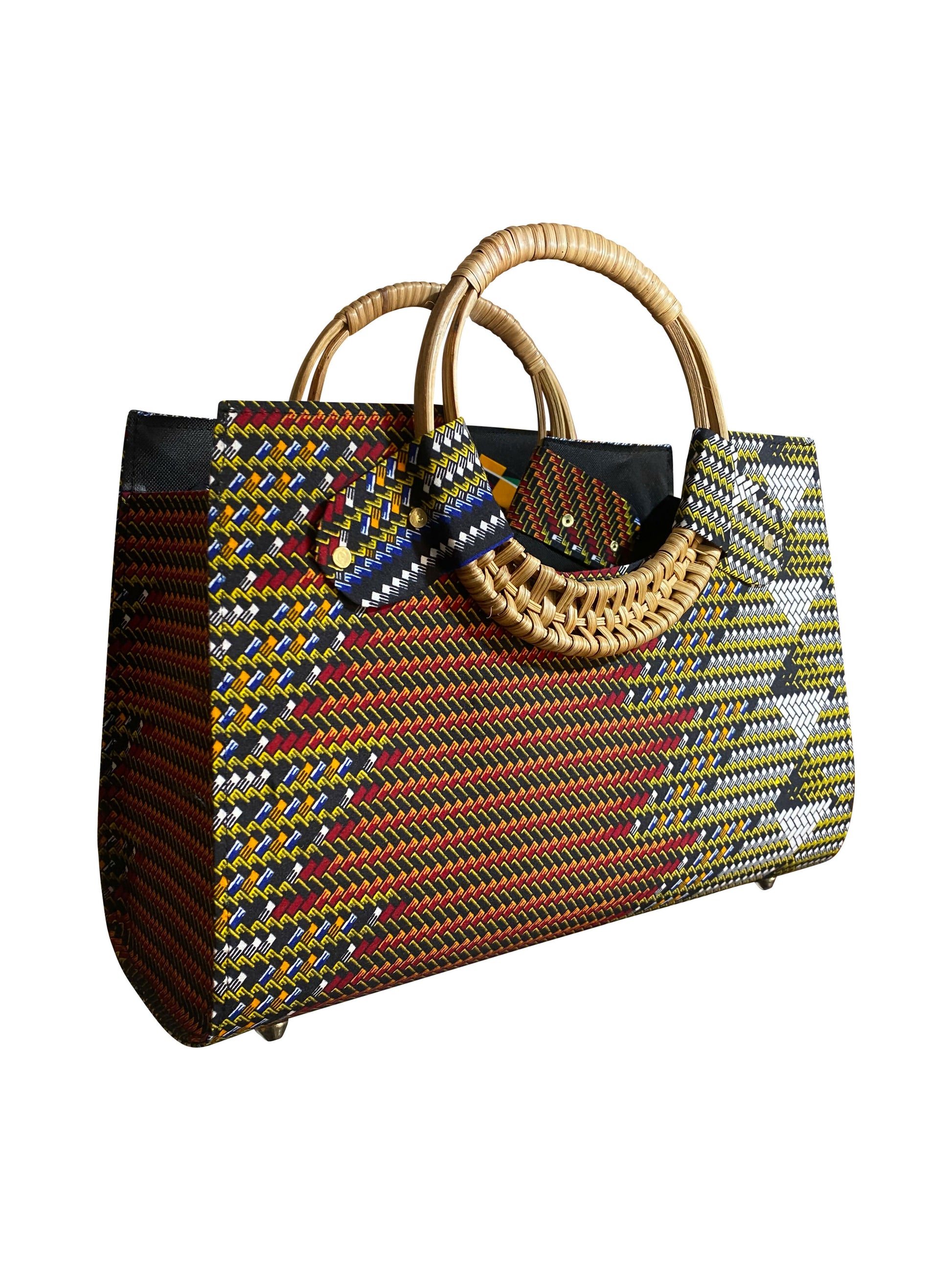 Diese stilvolle Handtasche verbindet traditionellen afrikanischen Kente-Stoff mit einem natürlichen Griff aus geflochtenem Elefantengras. Die Kombination aus farbenfrohem Muster und handgeflochtenem Naturmaterial verleiht der Tasche einen besonderen, authentischen Charakter.