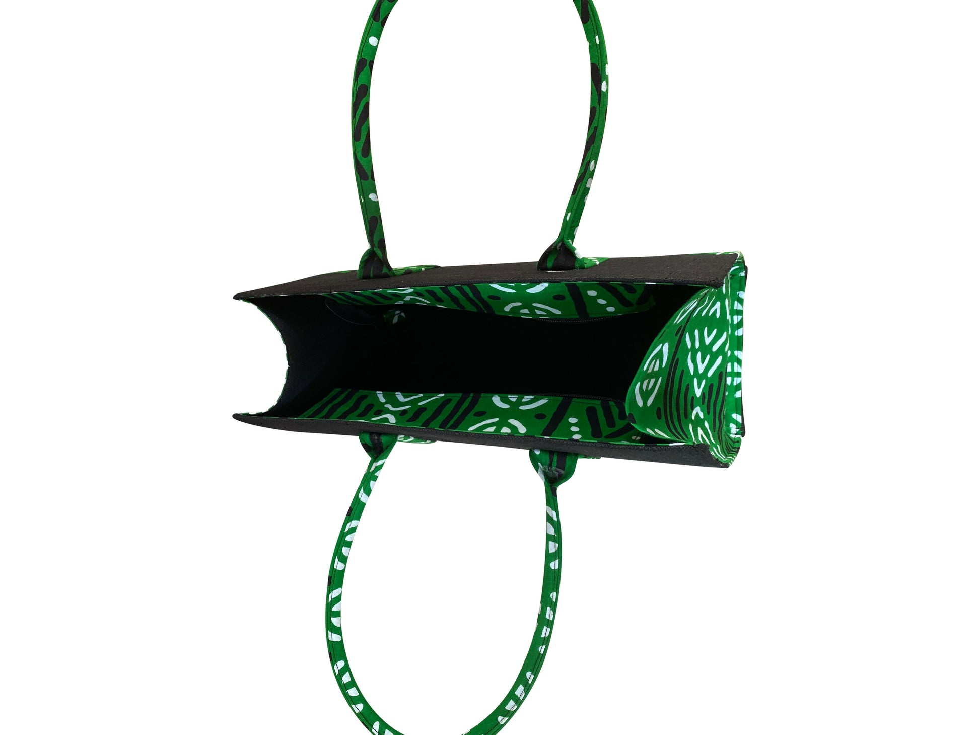 Diese handgefertigte Tasche aus Ghana kombiniert robusten Jutestoff mit Baumwollstoff und vereint natürliche Materialien mit traditionellem afrikanischem Design. Der schwarze Jutekörper wird durch grüne Baumwollstoffe mit afrikanischen Mustern ergänzt und sorgt für einen markanten, zugleich zeitlosen Look.