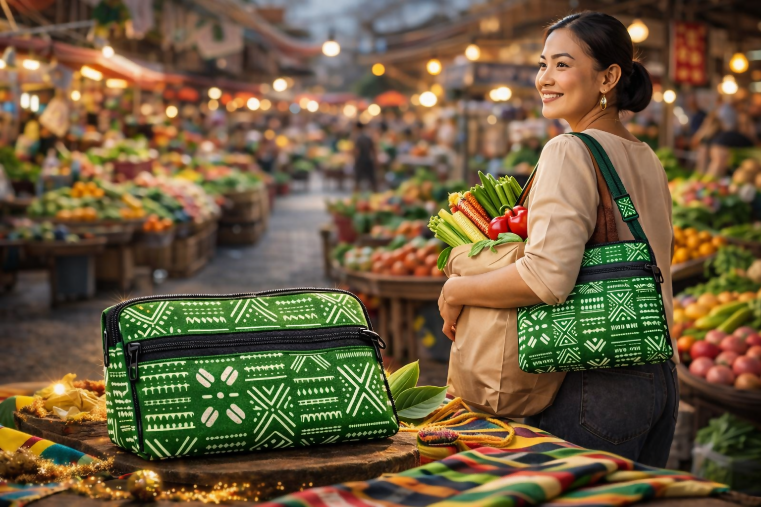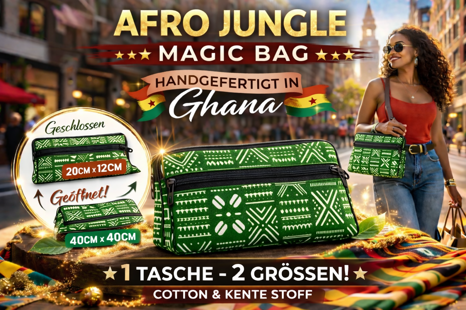 Die AFRO JUNGLE MAGIC BAG vereint kräftiges Dschungelgrün mit klaren, grafischen Musterelementen im traditionellen Afrika-Design. Die Kombination aus moderner Klarheit und kultureller Tiefe macht diese Tasche zu einem stilvollen Statement urban, natürlich und selbstbewusst.