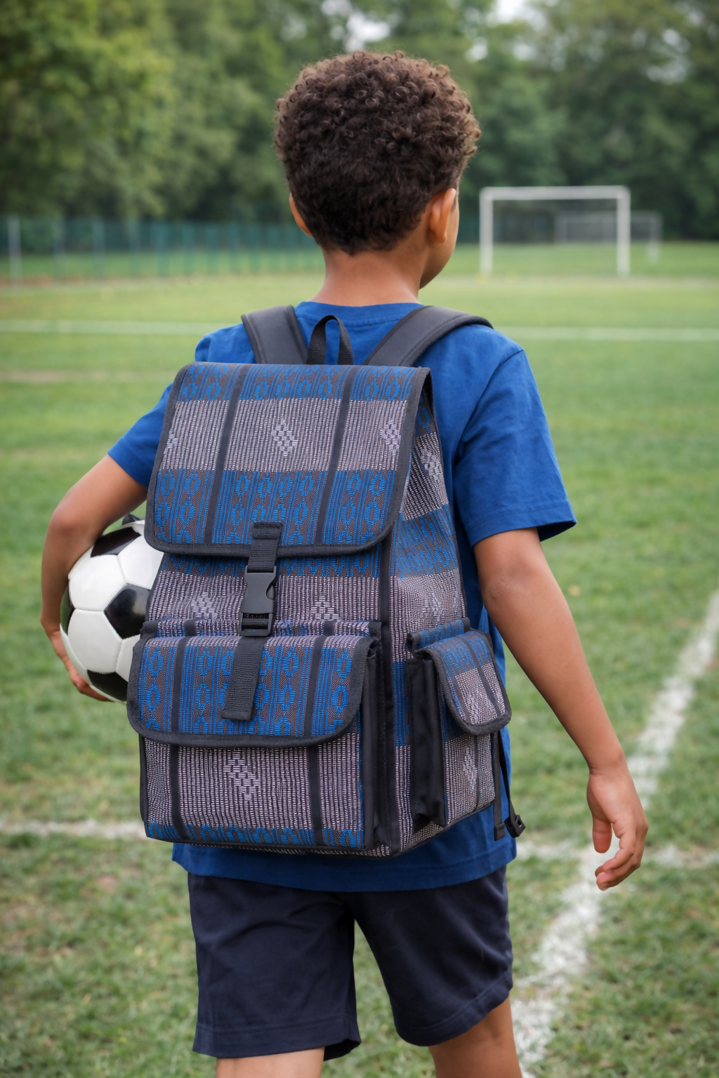 Der Classic Weave Rucksack ist ein authentisches Produkt ghanaischer Handwerkskunst, das in sorgfältiger Handarbeit in Ghana gefertigt wird. Das traditionell gewebte Muster in Blau- und Grautönen verleiht dem Rucksack einen zeitlosen Charakter und macht ihn zu einem vielseitigen Begleiter für Alltag und Reisen.