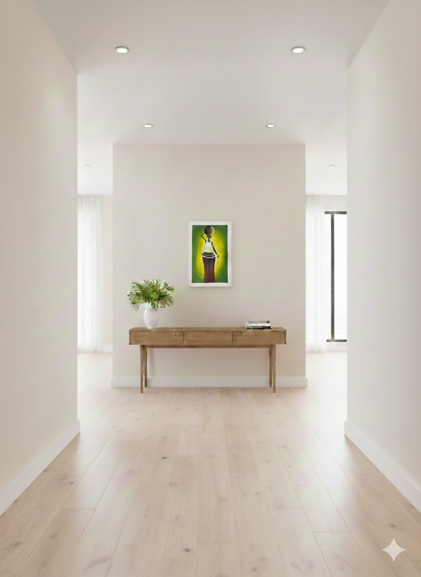 Ein handgefertigtes Unikat, das afrikanische Bildsprache, Alltag und innere Stärke in einer klaren, ruhigen Darstellung verbindet.
