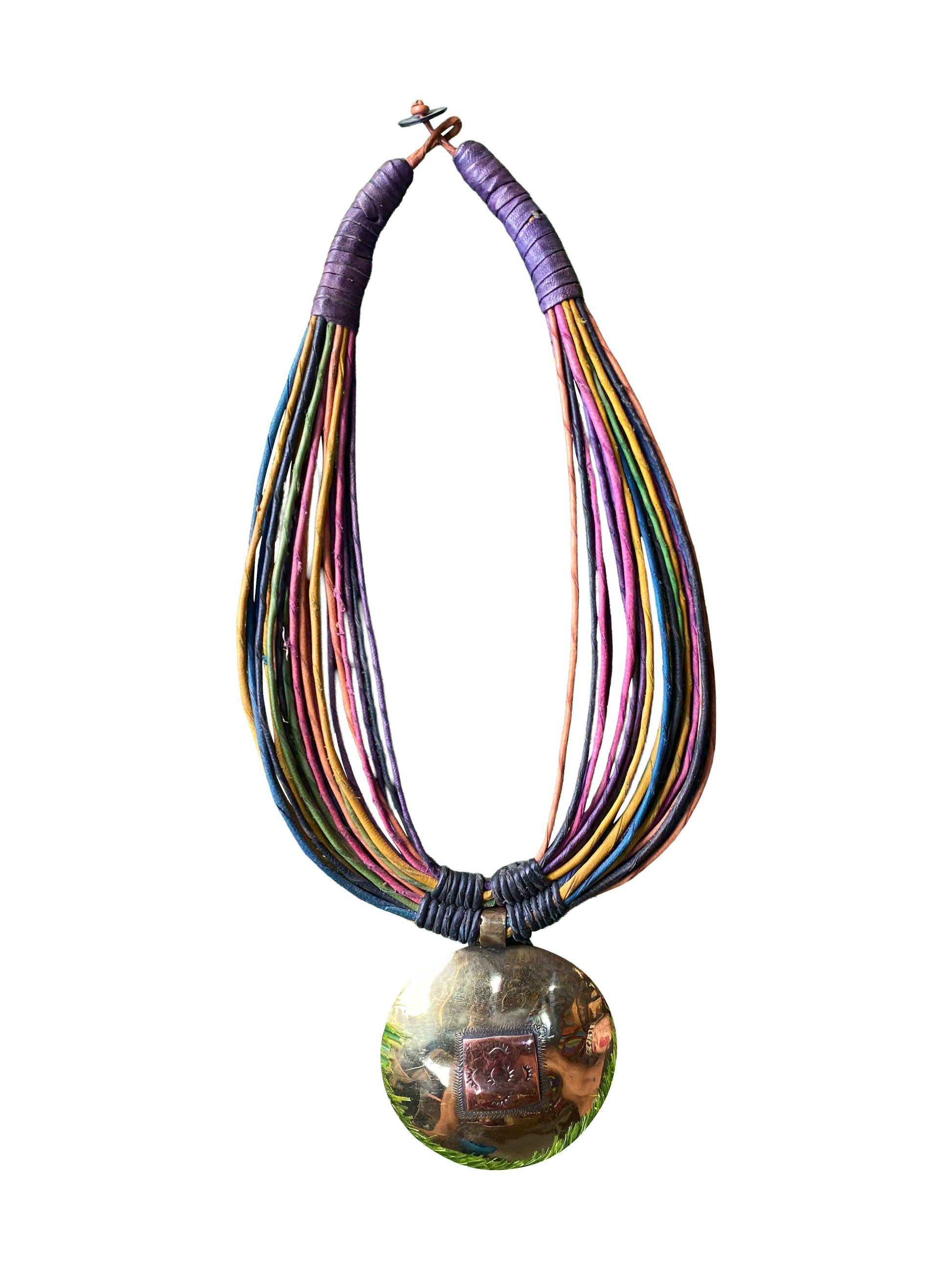 Die mehrsträngigen Lederbänder verweisen auf eine ebenso lange Tradition der Lederverarbeitung. Leder war und ist ein alltägliches, aber zugleich hochwertiges Material, das durch Färbung, Flechtung und Bündelung individuell gestaltet wird. Die Kombination aus Leder und Metall ist typisch für Schmuckstücke, die sowohl robust als auch ausdrucksstark sein sollen.