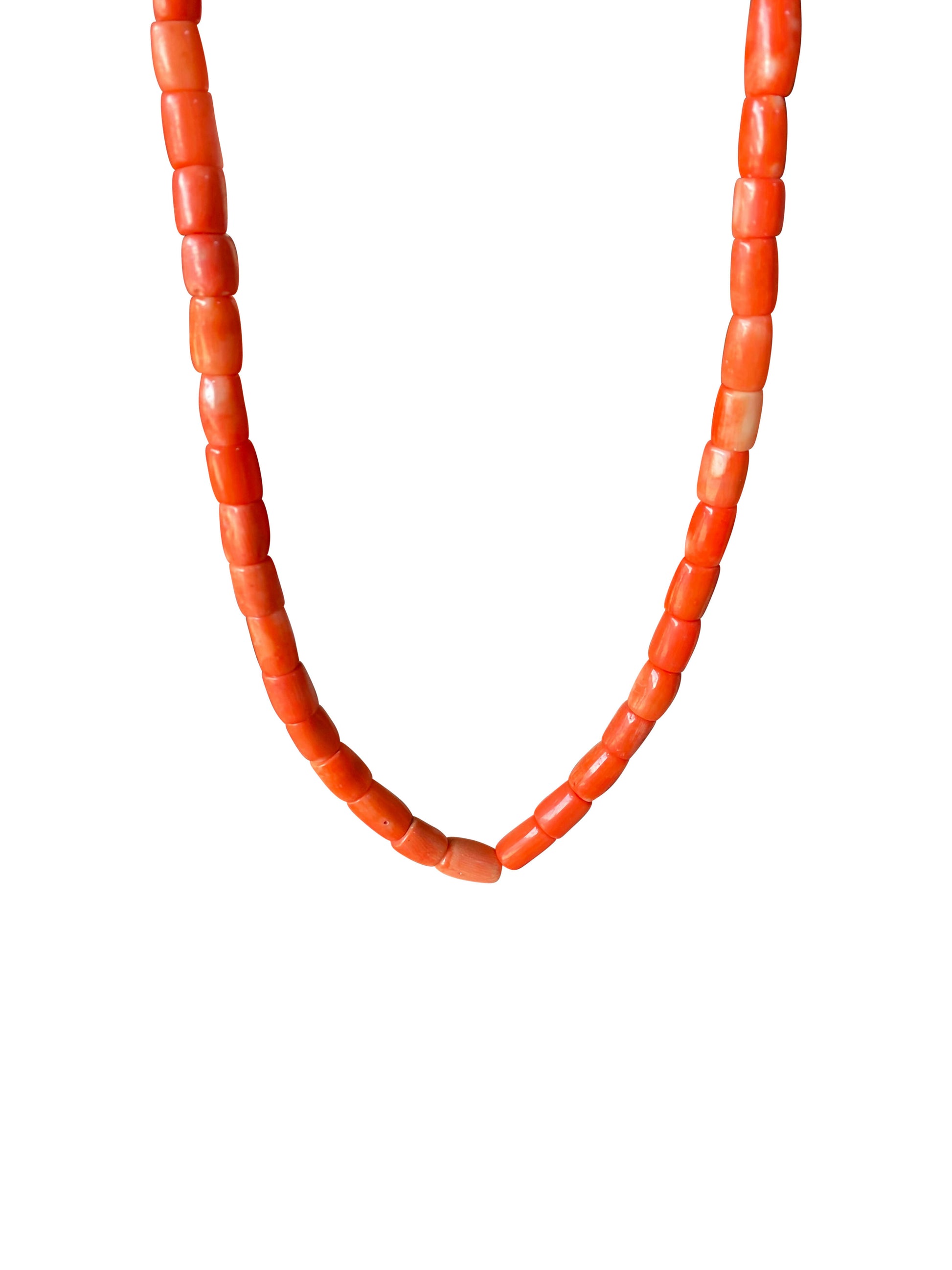 Diese zarte, handgefertigte Korallenkette besticht durch ihre warme, natürliche Ausstrahlung. Die Kette besteht aus echten Korallenperlen in verschiedenen Orangetönen, von kräftigem Korallenrot bis hin zu sanften Apricot-Nuancen. Die Perlen haben eine schöne, längliche und runde Form und sind sorgfältig von Hand aufgefädelt.