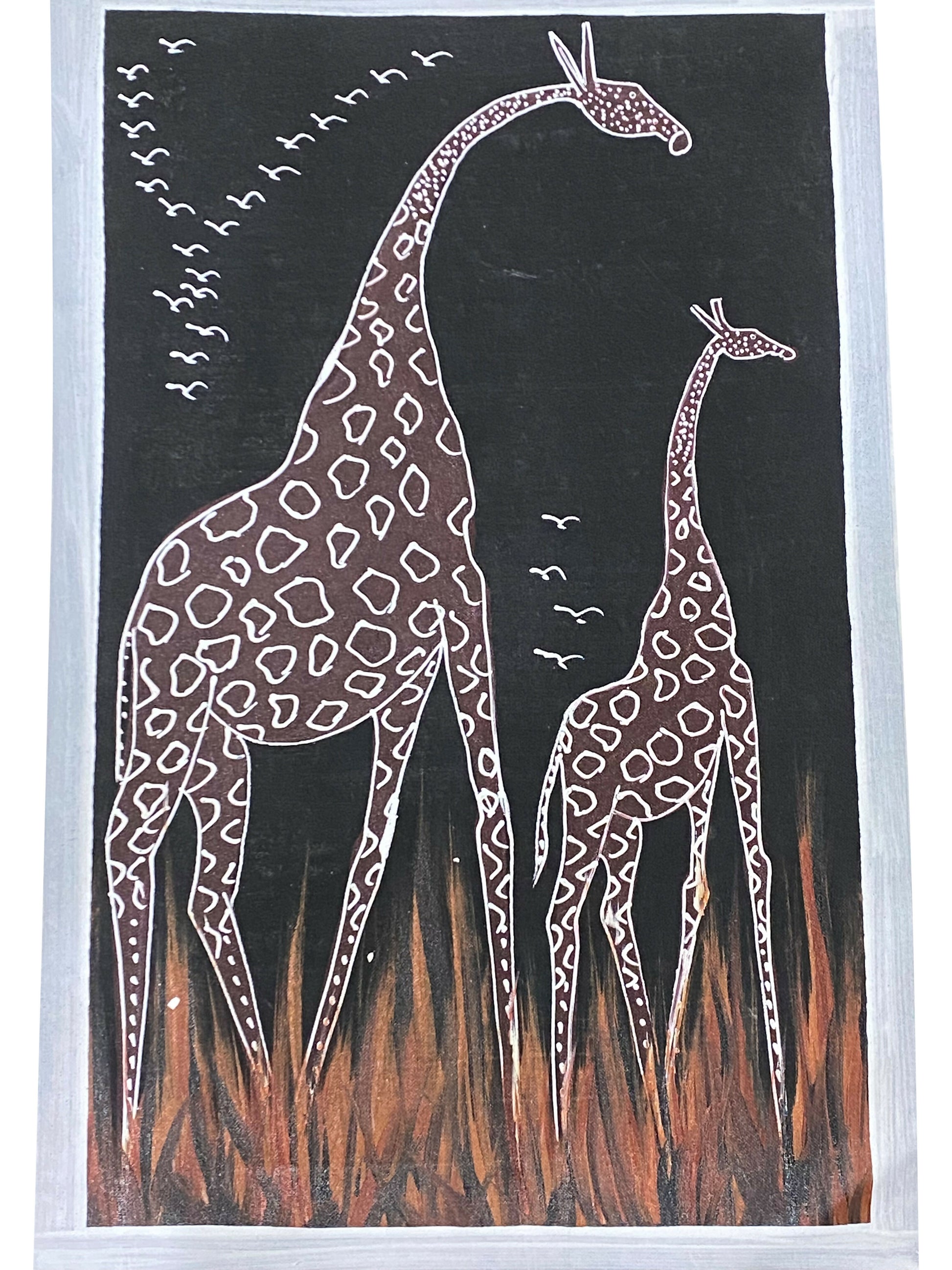 Die Komposition wirkt ruhig und ausgewogen. Die unterschiedliche Größe der Giraffen kann als Symbol für Schutz, Nähe und gemeinsames Wachstum gelesen werden, ohne aufdringlich zu wirken. Das Werk strahlt Gelassenheit, Naturverbundenheit und afrikanische Symbolkraft aus.