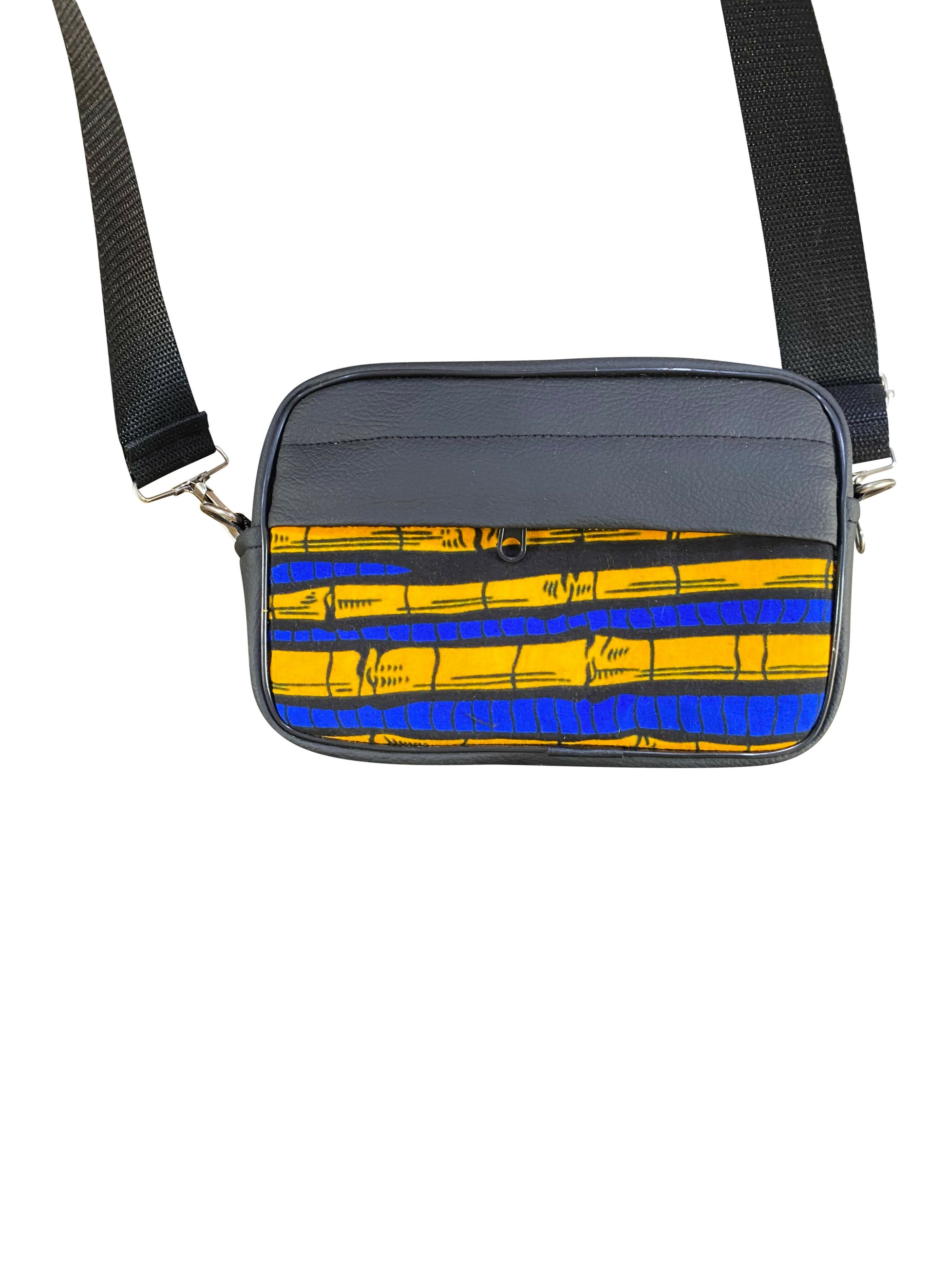 Das markante geometrische Afro-Muster in leuchtendem Blau und warmem Gelb verleiht der Tasche eine dynamische, ausdrucksstarke Optik. Die Farben stehen für Energie, Kreativität und kulturelle Tiefe. Der Kontrast zum schwarzen Lederrahmen sorgt für einen hochwertigen, zeitlosen Look.