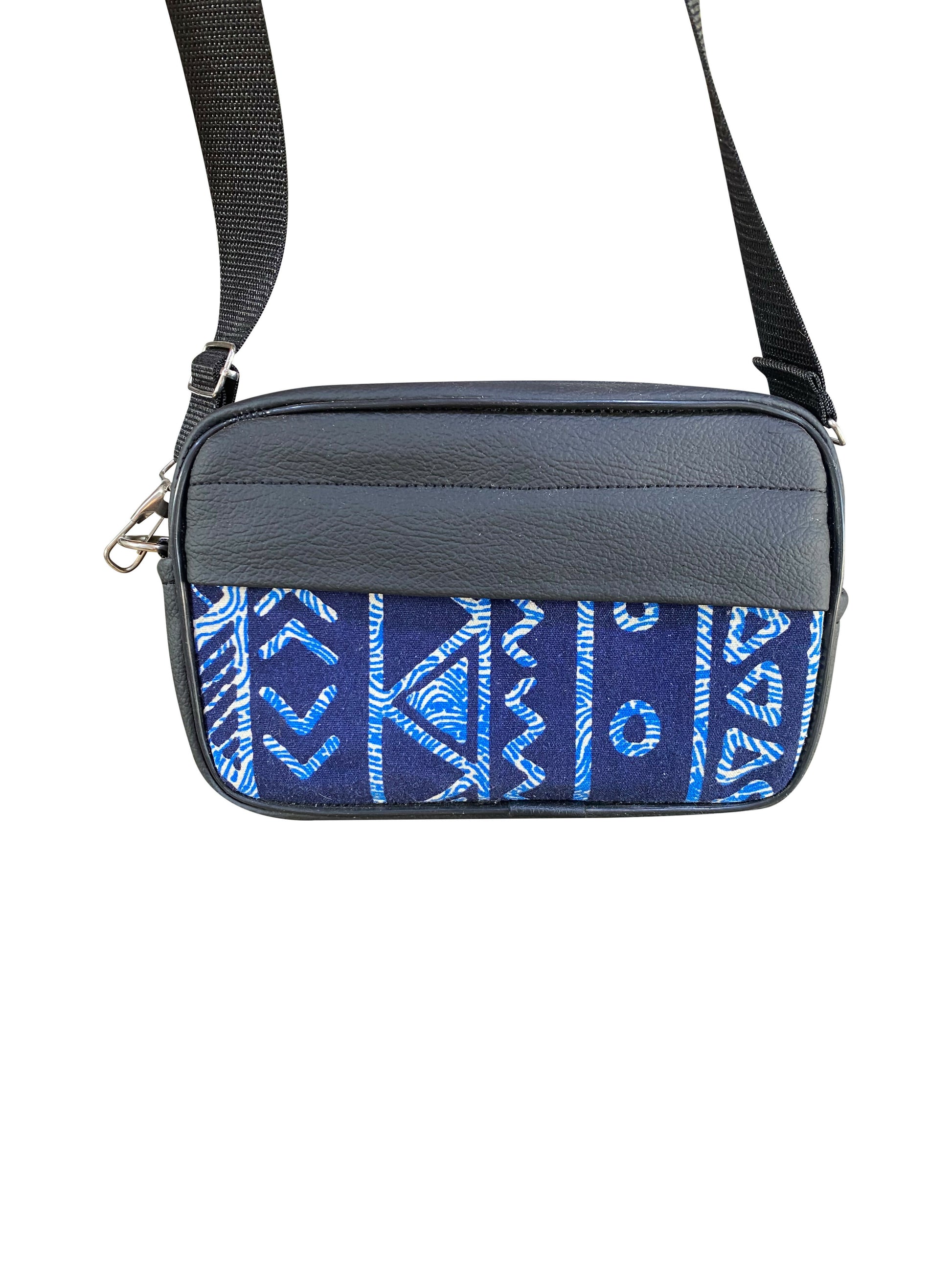Das ausdrucksstarke geometrische Afro-Muster in tiefem Blau mit hellblauen und weißen Akzenten verleiht der Tasche eine klare, ruhige und zugleich kraftvolle Ausstrahlung. Die Kombination aus robustem schwarzem Leder und hochwertiger Baumwolle sorgt für Stabilität, Langlebigkeit und ein angenehmes Tragegefühl.