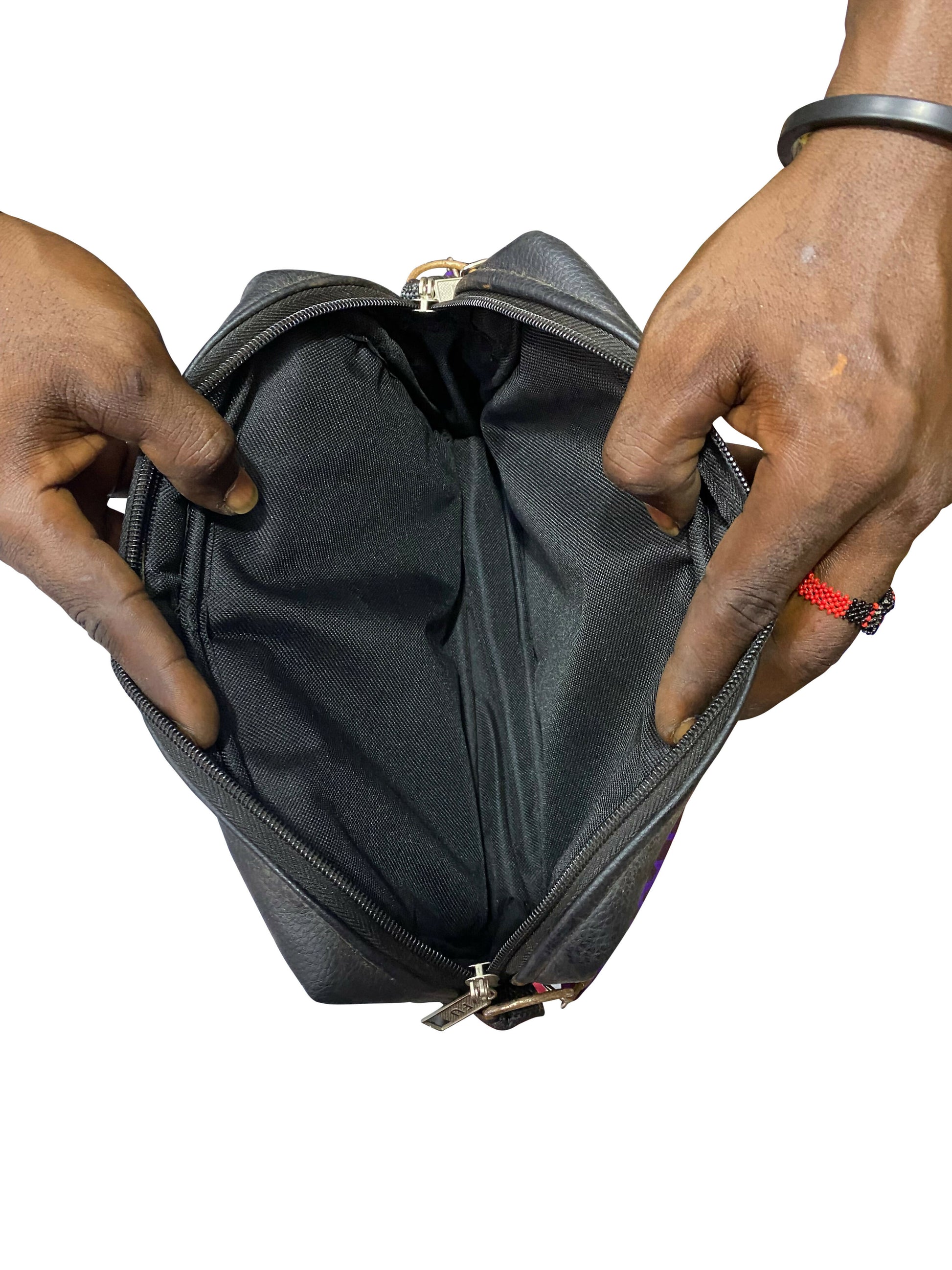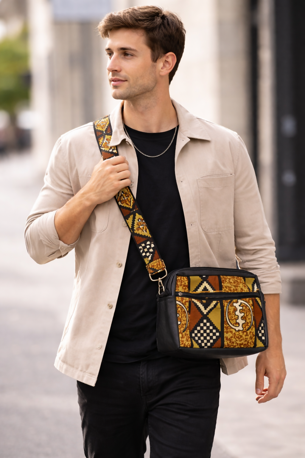Diese handgefertigte Umhängetasche aus Ghana überzeugt durch ihr traditionelles afrikanisches Adinkra-Muster und eine warme, erdige Farbpalette aus Ocker, Braun, Schwarz und Creme. Jedes Muster erzählt seine eigene Geschichte und macht die Tasche zu einem echten Unikat.