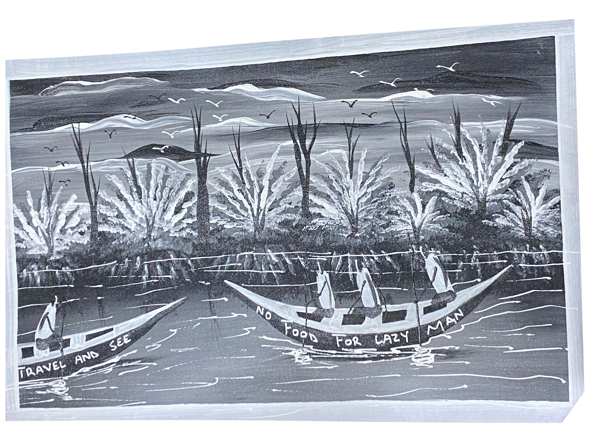 Dieses ausdrucksstarke, überwiegend in Schwarz-, Grau- und Weißtönen gehaltene Gemälde zeigt Boote auf einem ruhigen Gewässer, umgeben von Palmen, Vegetation und einem weiten Himmel mit fliegenden Vögeln. Auf den Booten stehen klare Botschaften geschrieben: „Travel and See“ und „No Food for Lazy Man“ kraftvolle Lebensweisheiten, die Arbeit, Bewegung und Erfahrung betonen.