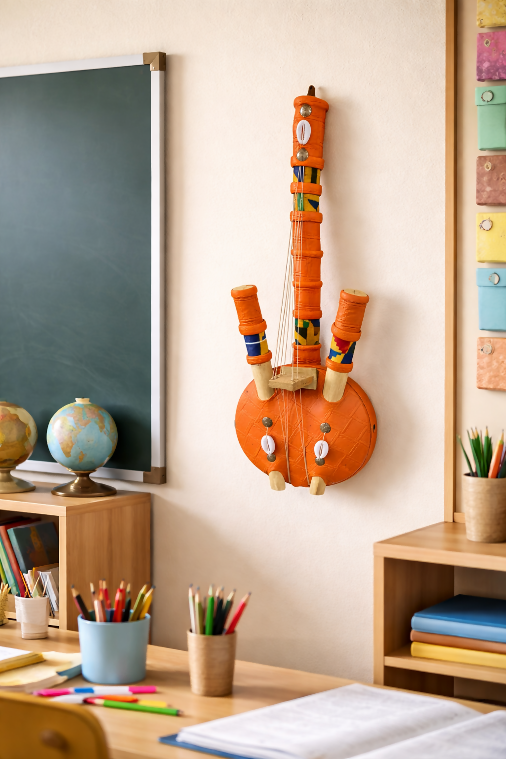 Dieses Instrument ist keine klassische Gitarre im westlichen Sinn. Es handelt sich um ein handgefertigtes westafrikanisches Saiteninstrument aus Ghana, das stilistisch an Ngoni- und Kora-Formen erinnert und sowohl spielbar als auch dekorativ ist.