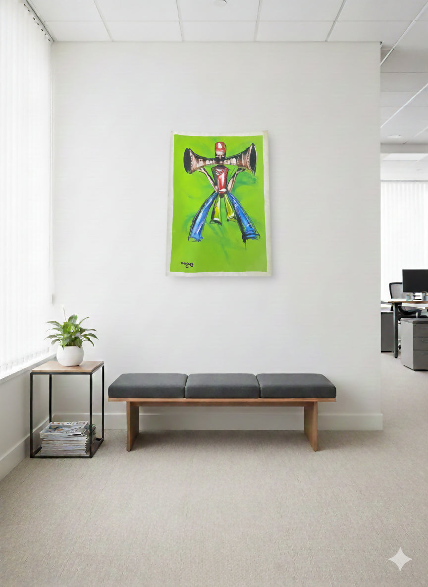 Die Komposition vermittelt Rhythmus, Energie und musikalische Tradition. Die Haltung der Figur wirkt kraftvoll und gleichzeitig spielerisch, als sei sie mitten in einer Bewegung oder einem Tanz. Das Bild verbindet Musik, Bewegung und afrikanische Ausdruckskraft in einer klaren, modernen Bildsprache.