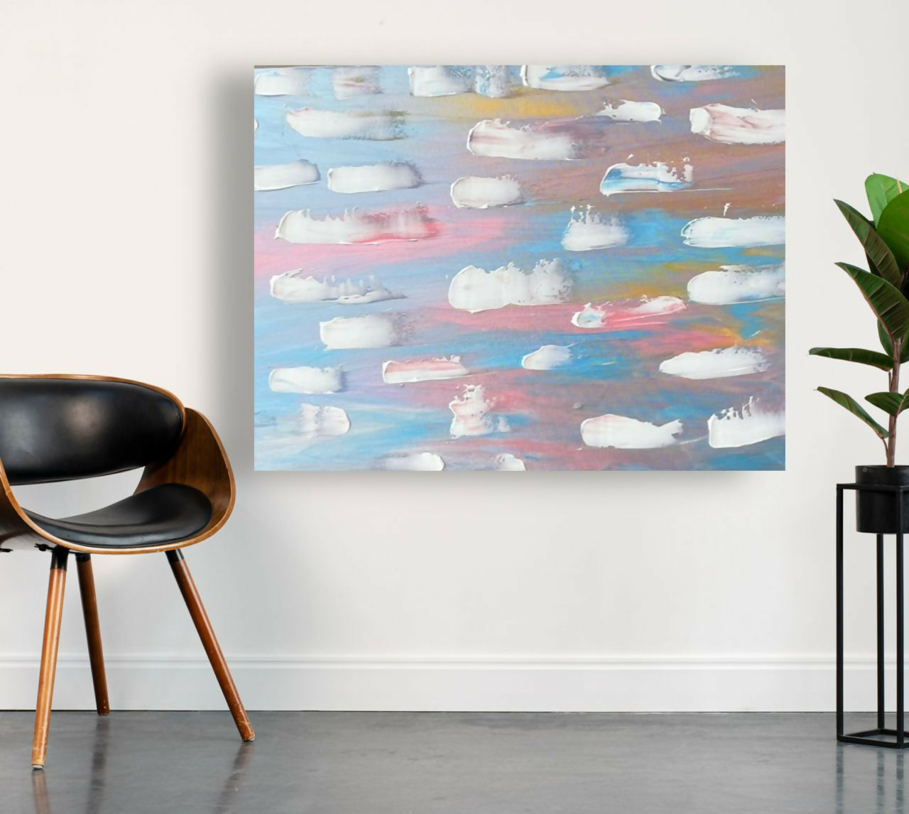 Die Künstlerin arbeitet überwiegend mit großformatigen Leinwänden, wodurch ihre Werke besonders gut als zentrale Wandkunst in Wohnräumen wirken.