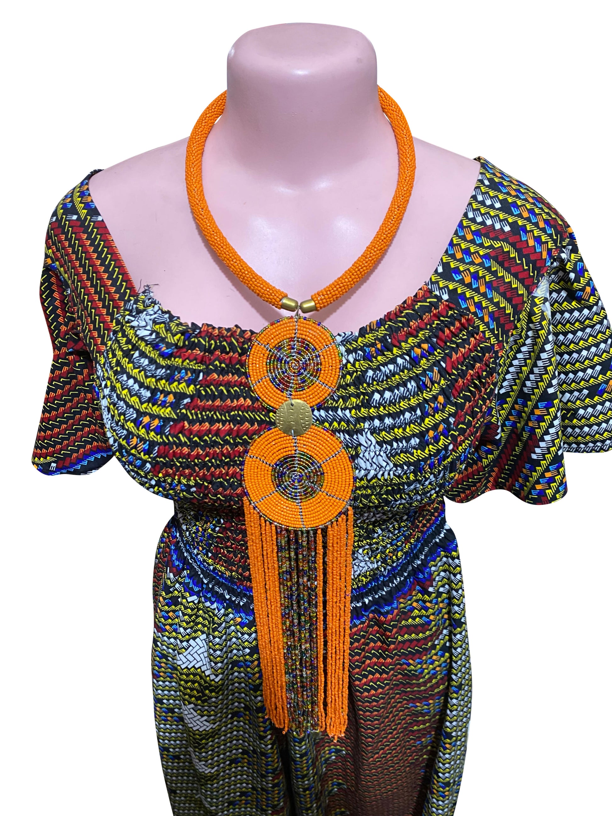 Mit einer Gesamtlänge von 63 cm fällt die Kette bis weit nach unten und eignet sich perfekt als Blickfang zu schlichten Outfits, afrikanischen Stoffen oder als künstlerisches Statement-Piece. Jedes Exemplar ist ein handgefertigtes Unikatund verbindet afrikanische Handwerkskunst mit modernem Design.