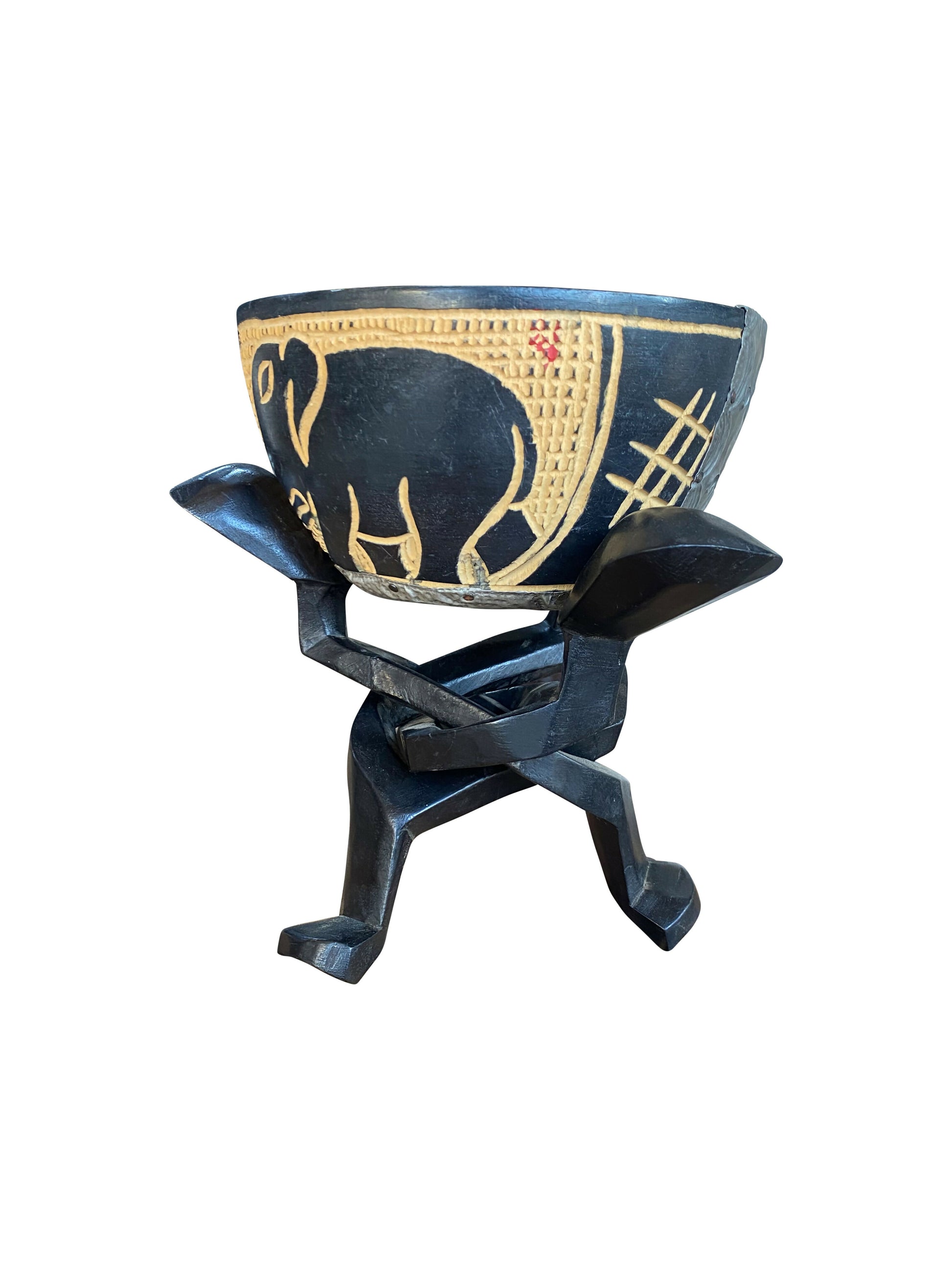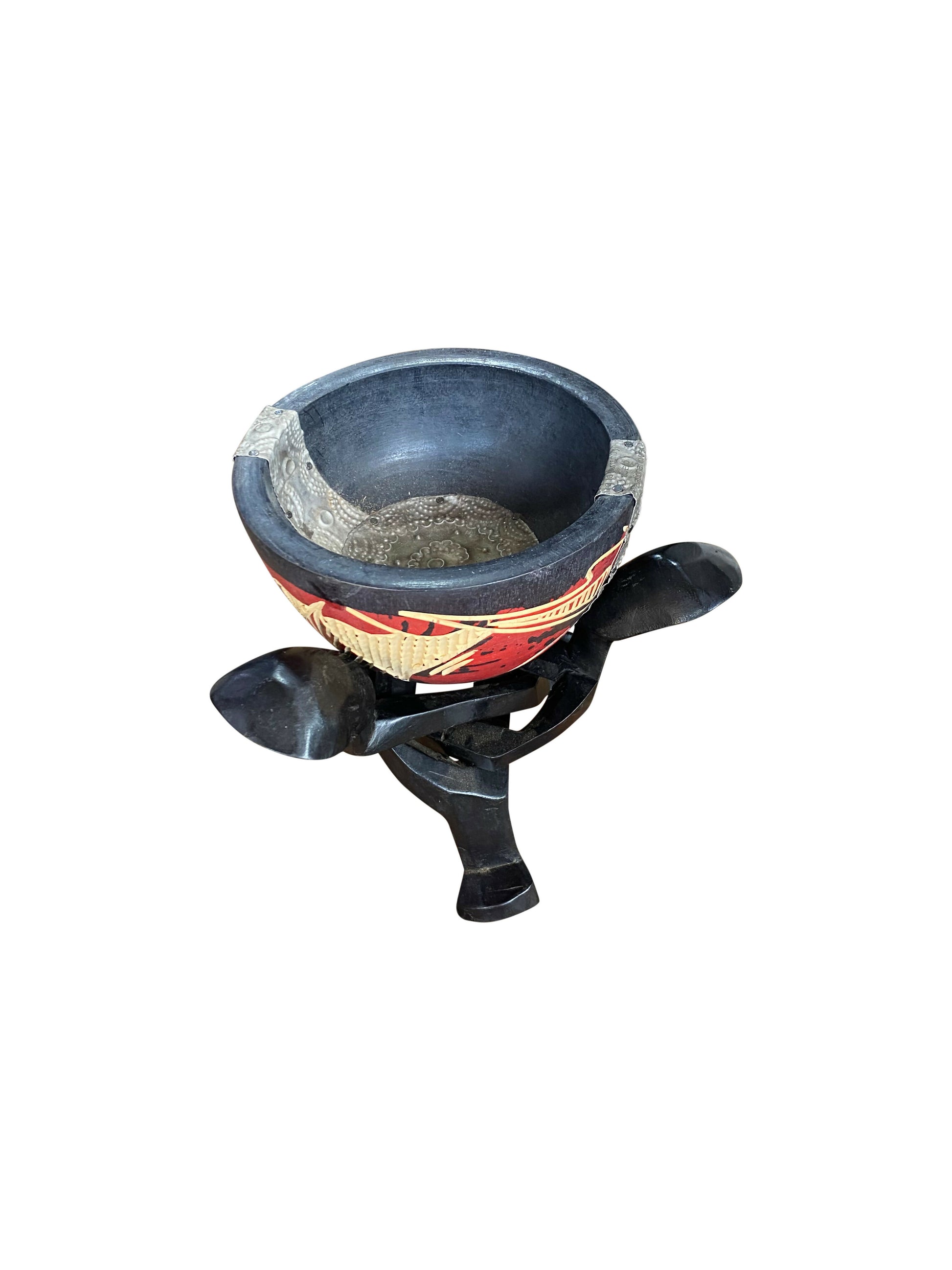 Dieser handgefertigte Behälter mit kunstvollem Ständer vereint traditionelle ghanaische Schnitzkunst mit markanter Formensprache. Die farblich verzierte Schale ruht auf einem kunstvoll verschlungenen Holzständer – ein Symbol für Stabilität, Verbundenheit und Handwerkskunst.