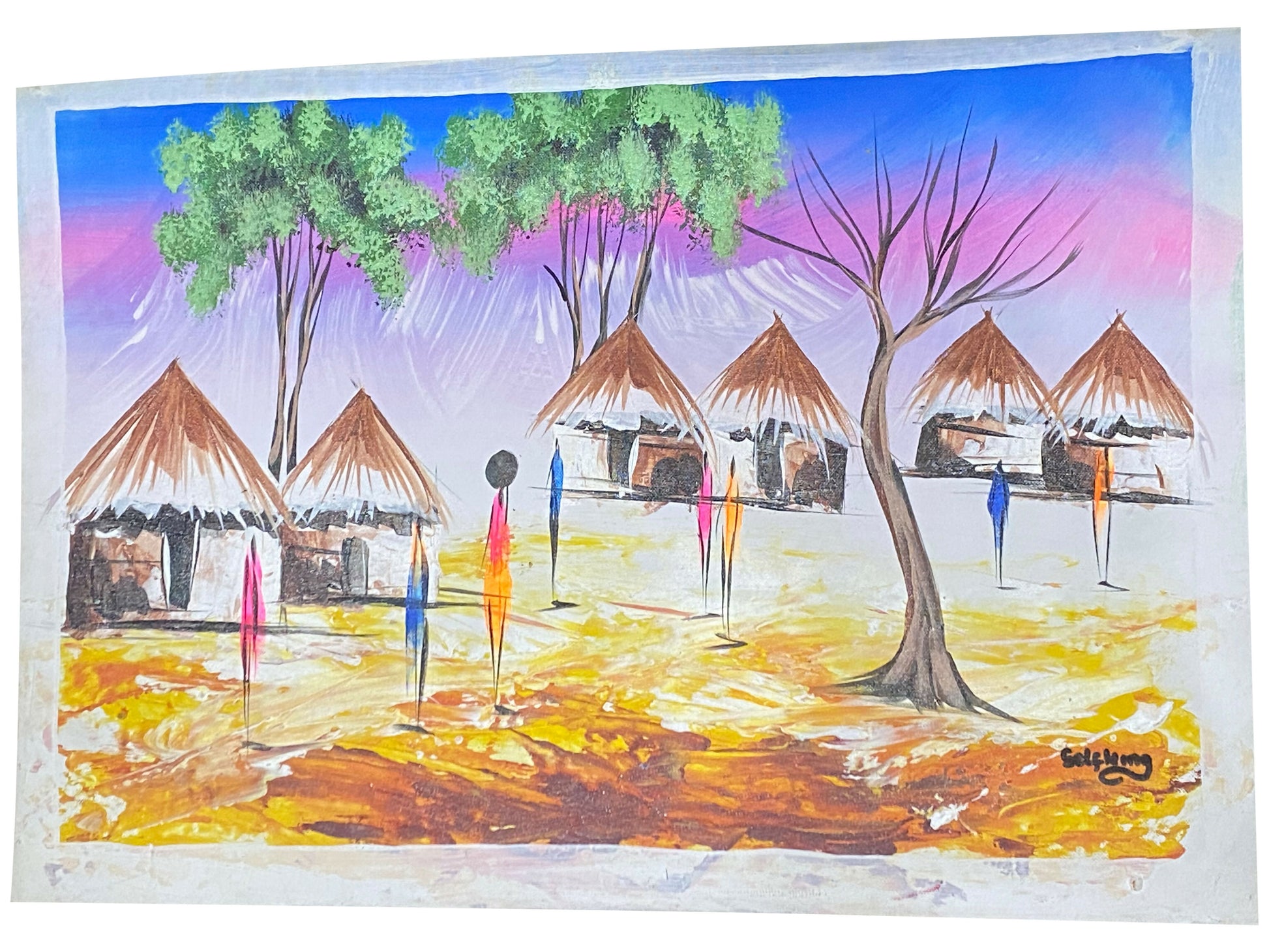 Village Harmony/ Dorfleben im Licht Handgemalte Acrylkunst aus Ghana (50 × 69 cm)